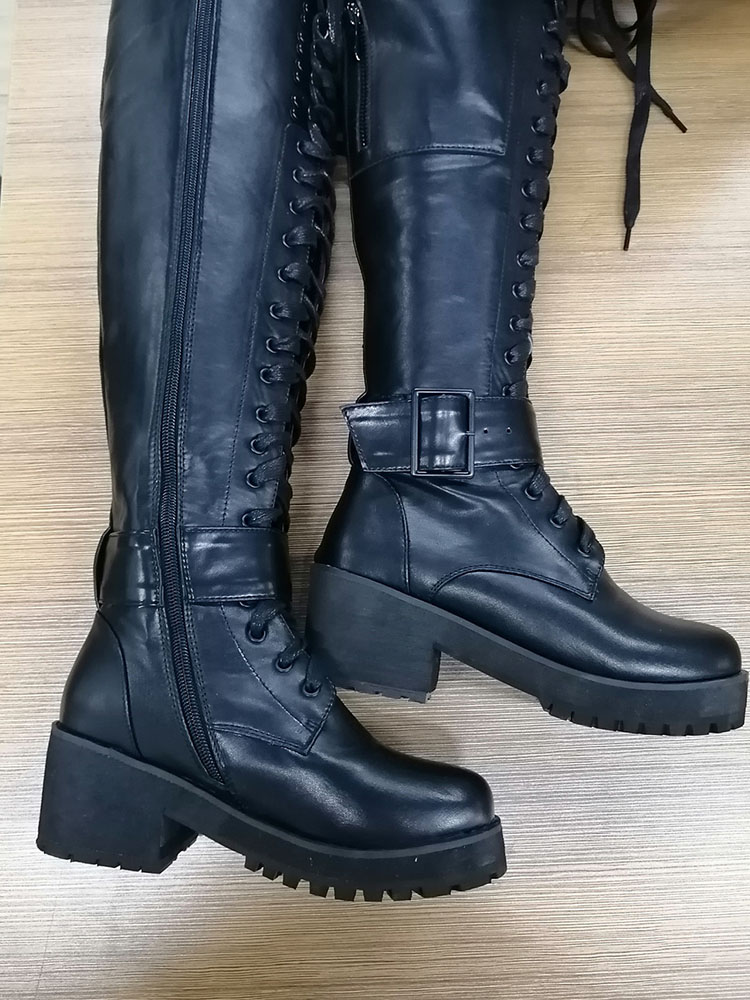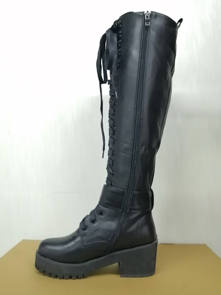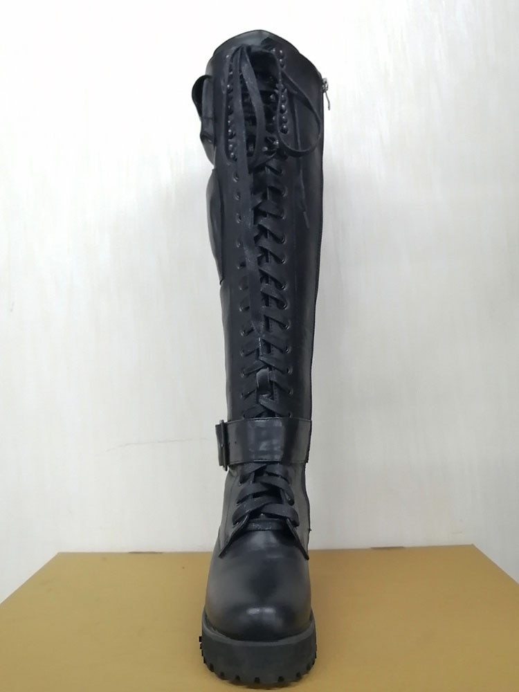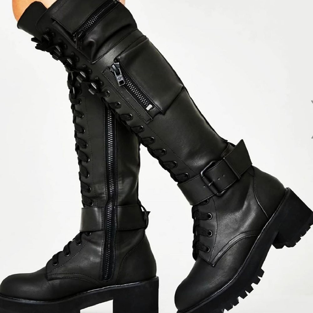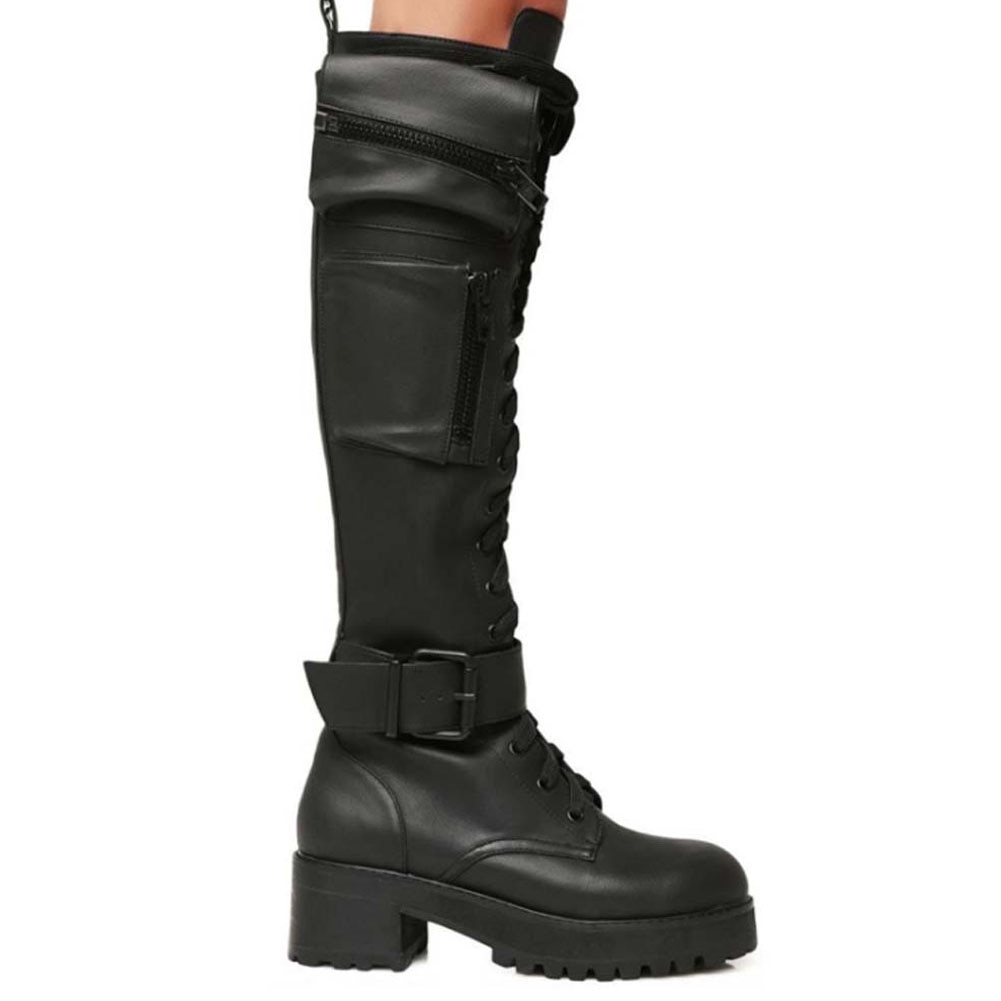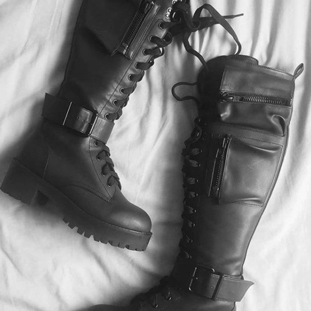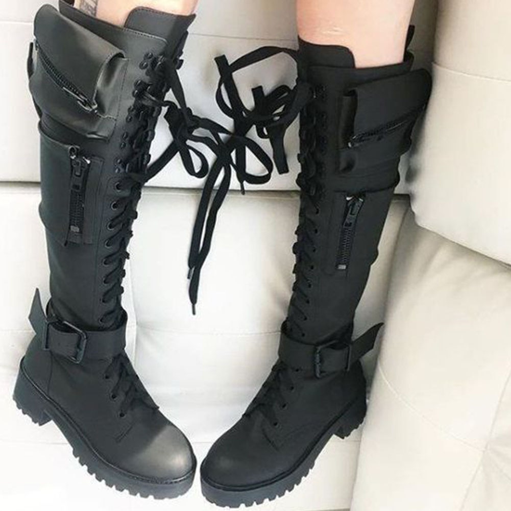 Niulatu High Quality Female Motorcycle Boots Square Heel Lace-Up Narrow Band Winter Cool Street Women Knee High Boots Shoes DJSE