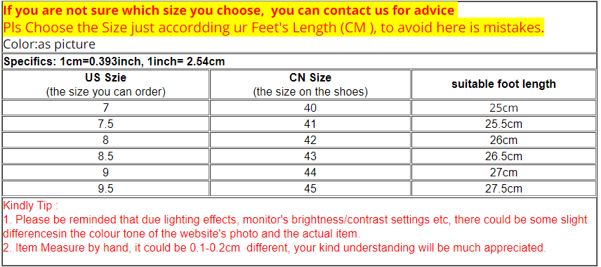 - Please according your foot length to select correct size .please contact to us , if you are not sure size .Please tell me your foot Length (NO YOUR COUNTRY SIZE)?So we can quickly suggest size to you thanks