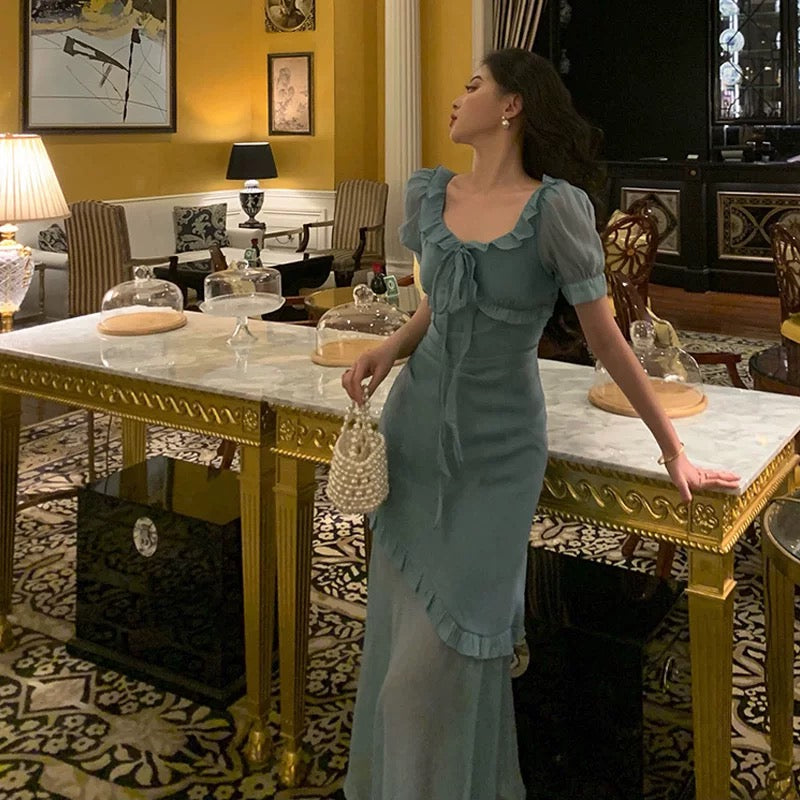Niulatu Mermaid Square Neckline Short Sleeves Blue Chiffon Prom Dresses Birthday Outfits Evening Gown SD993