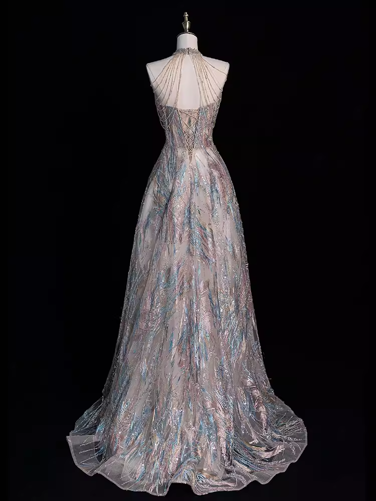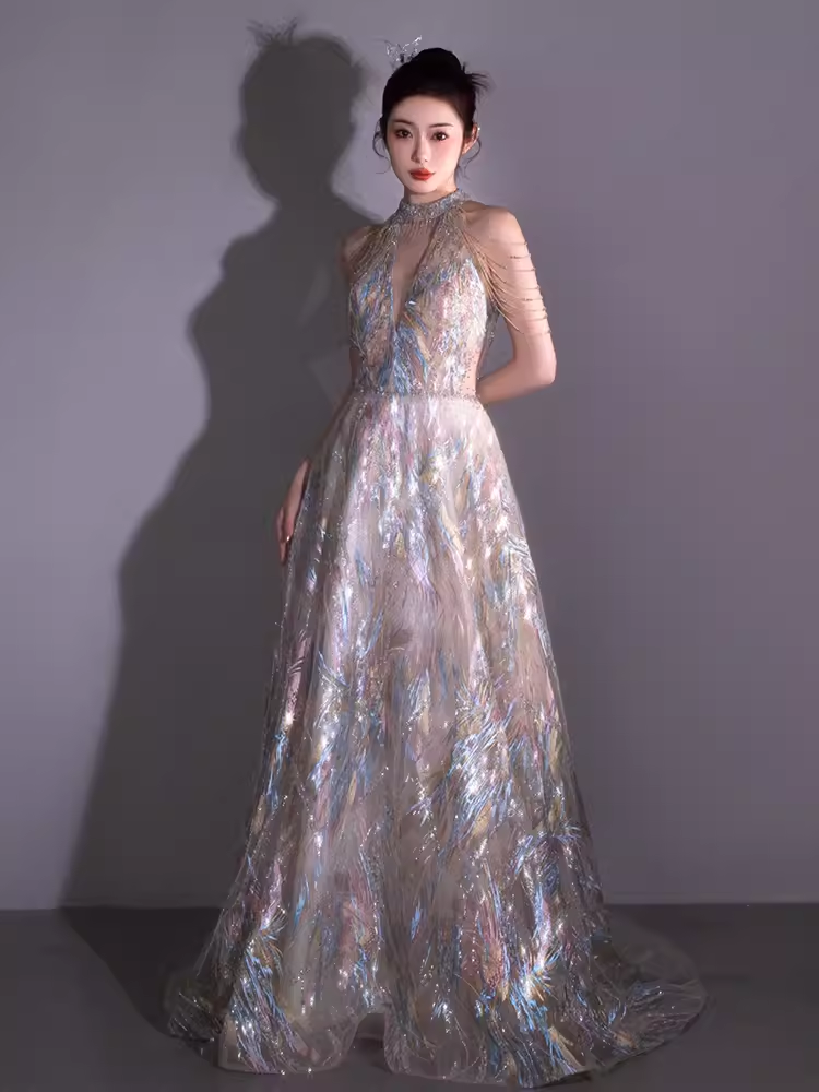 Niulatu A line High Neckline Sequin Beads Long Evening Dress Prom Dresses HZ1110