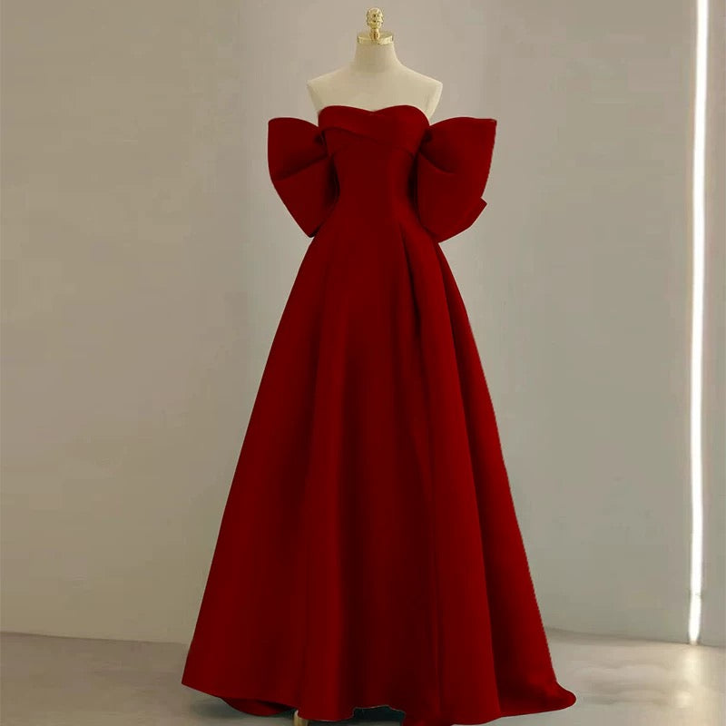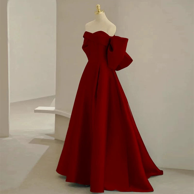 Niulatu A Line Off The Shoulder Satin Burgundy Prom Dress Long Evening Dresses With Bow HZ1110