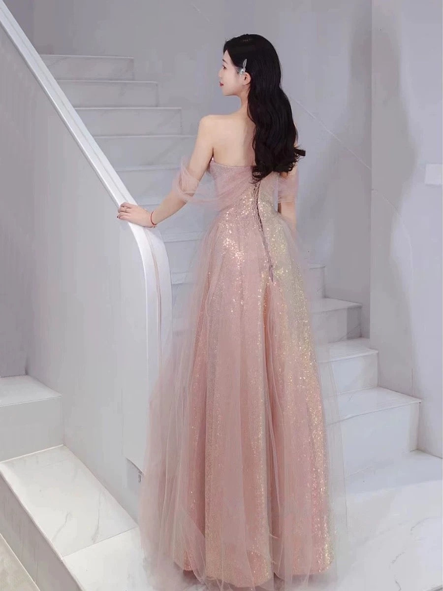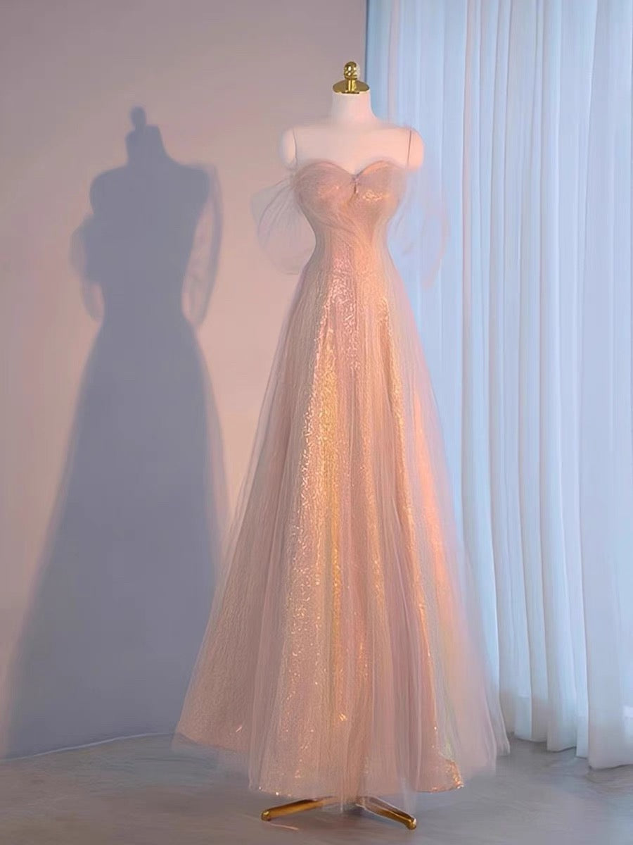 Niulatu A Line Spaghetti Straps Pink Sequin Long Prom Dress Evening Dresses HZ1110