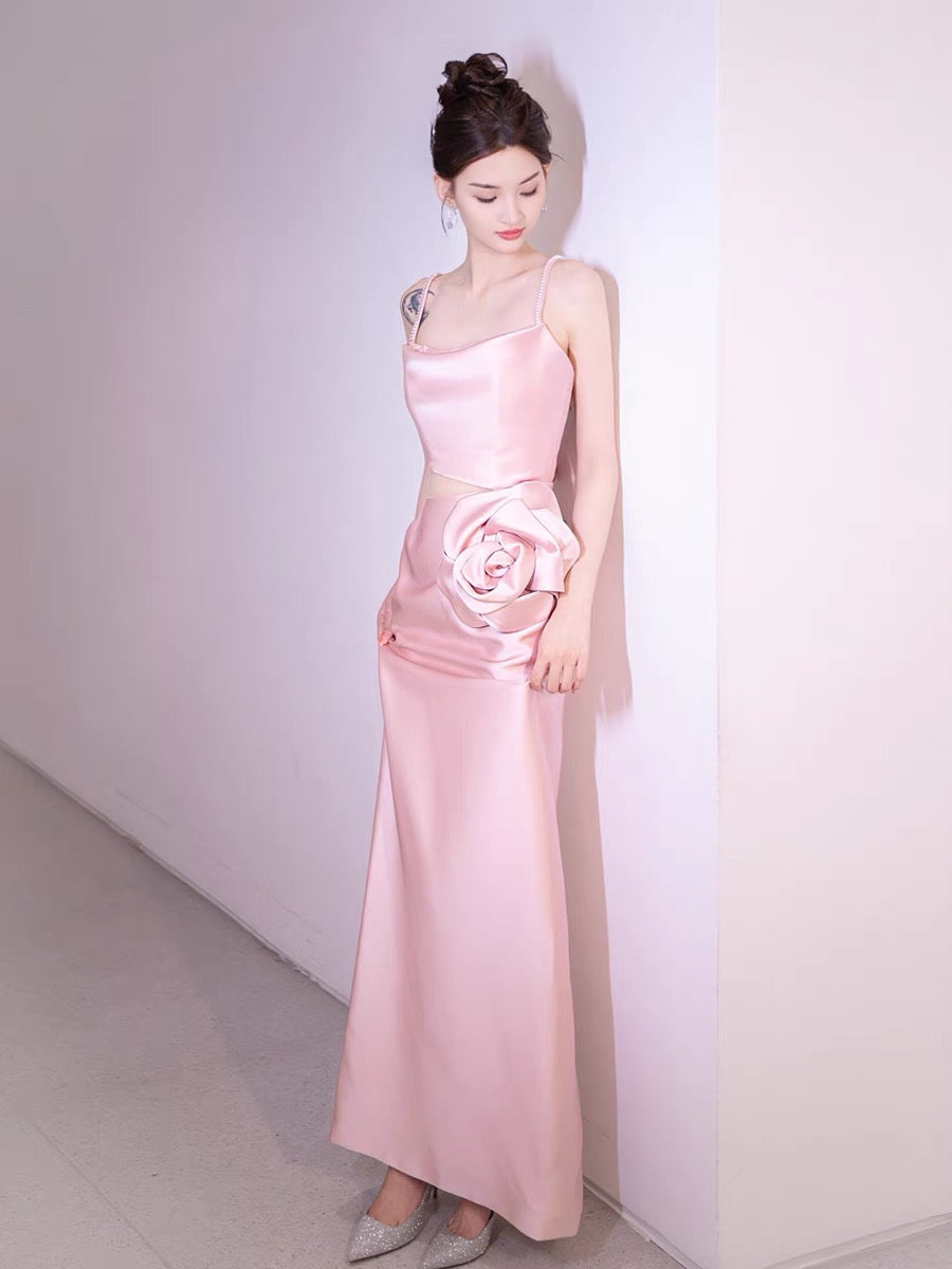 Niulatu A-line Spaghetti Straps Satin Pink Long Evening Dress Prom Dress HZ1110