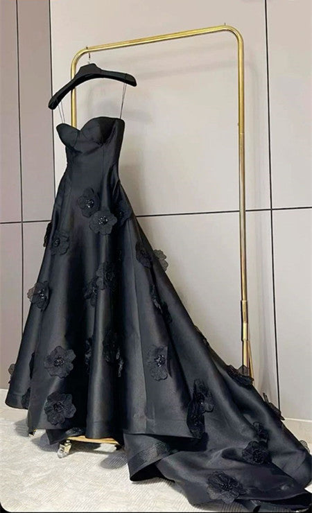 Niulatu A line Sweetheart Black Satin Prom Dress Evening Dresses With Flowers HZ1110