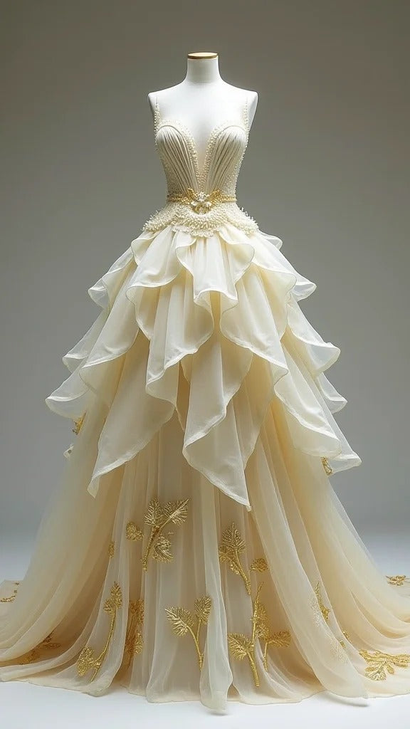 Niulatu Apricot Deep V Neck A-Line Layered Tulle Long Prom Dresses Formal Evening Gowns HZ1103