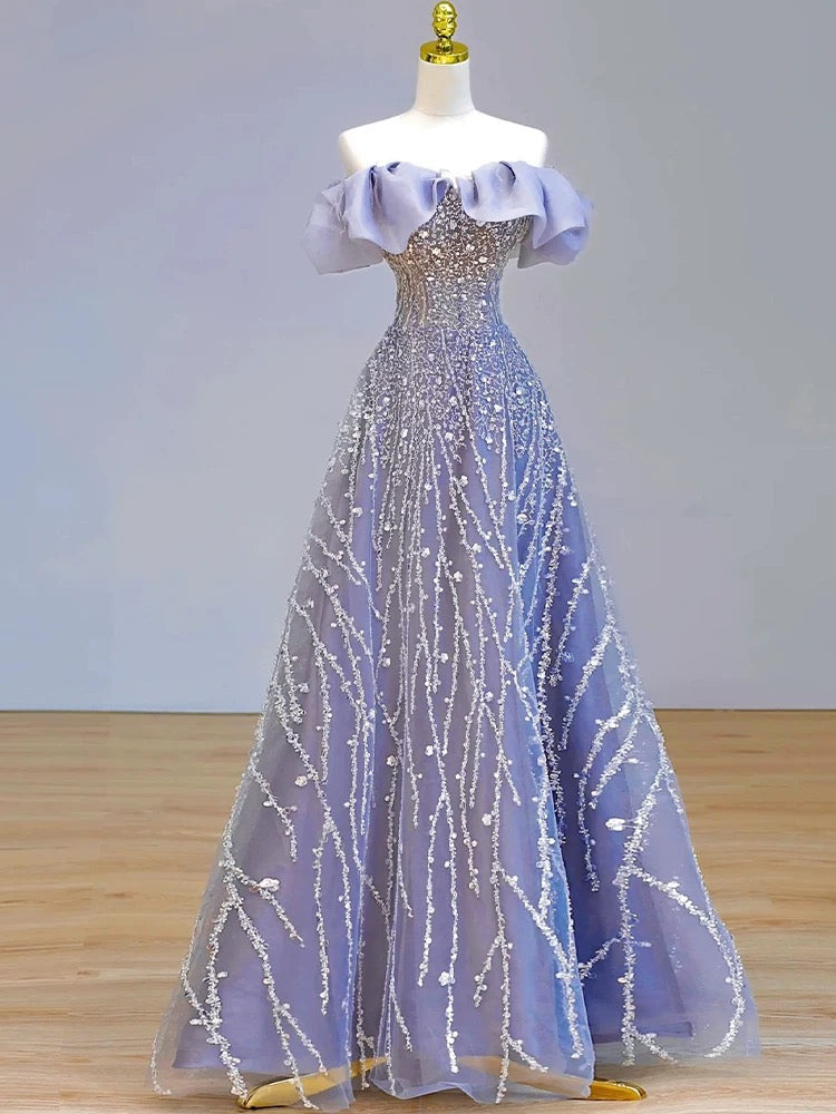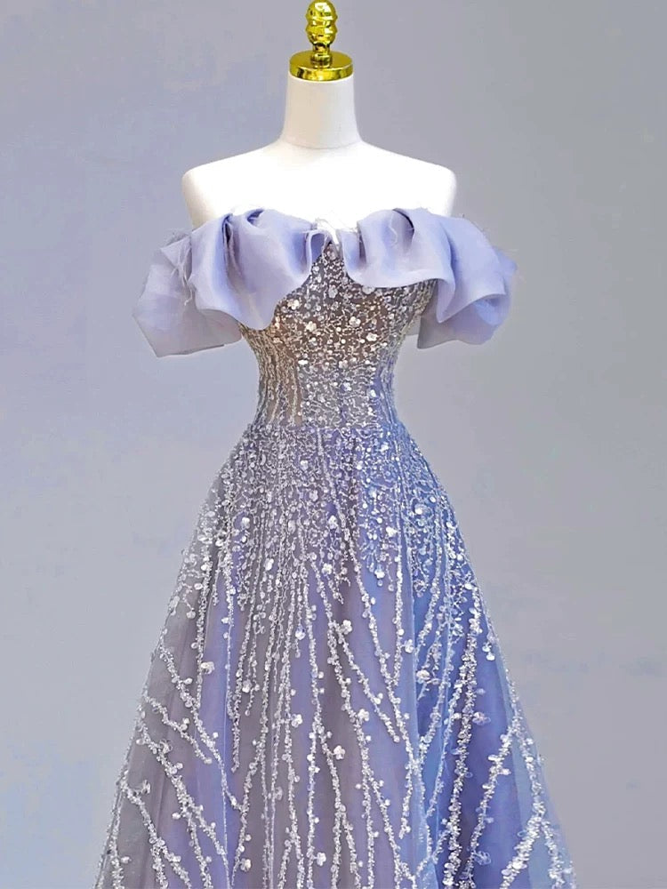 Niulatu Ball Gown Off The Shoulder Lilac Short Sleeves Sequin Evening Dress Long Prom Dresses HZ1110