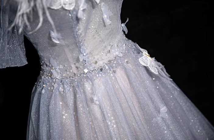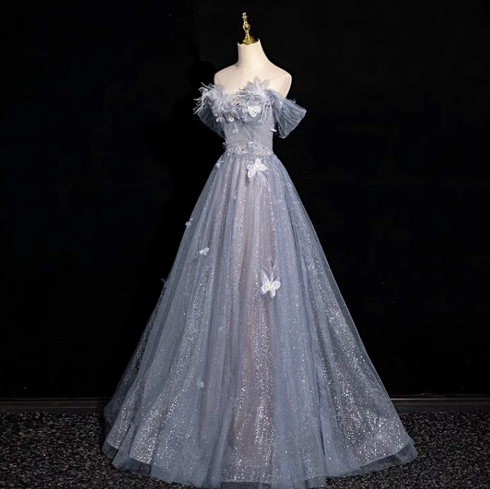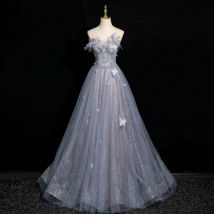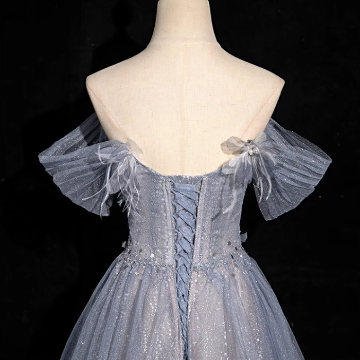 Niulatu blue A-line sweetheart neck tulle sequined long prom dress, gray blue evening dress HZ1108