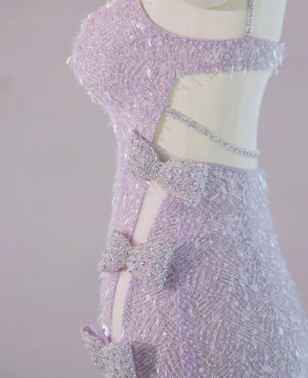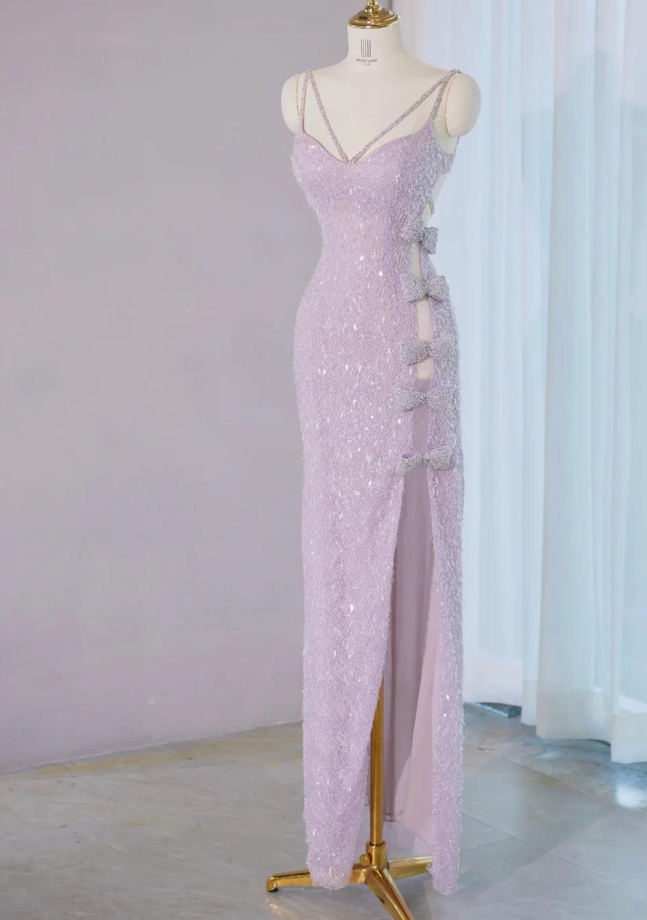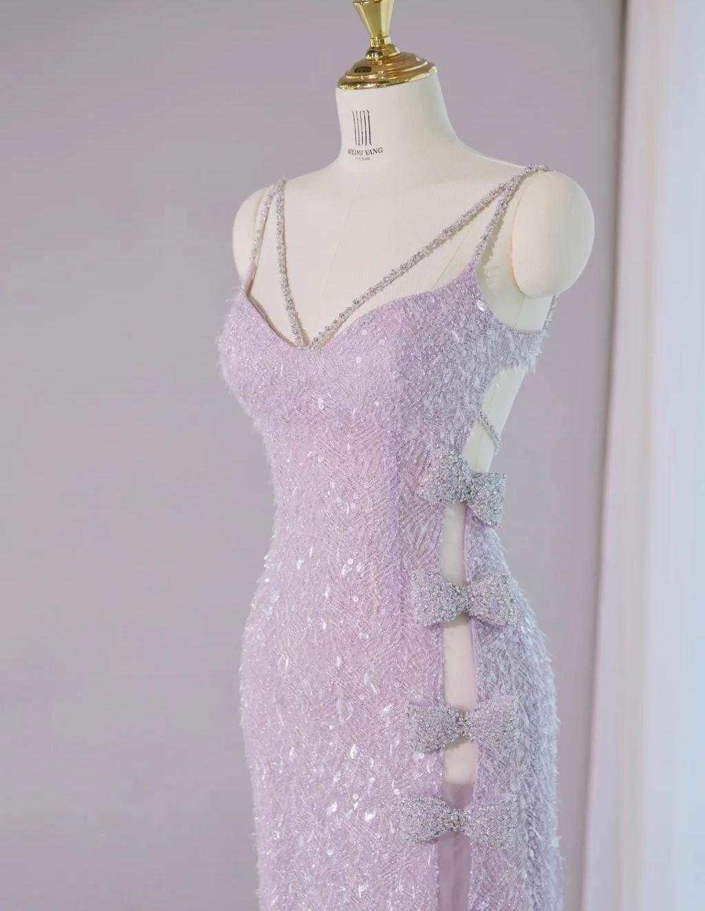 Niulatu Light Purple V-neck Sheath Lace Beading Long Prom Dresses Formal Evening Gowns with Slits HZ1031