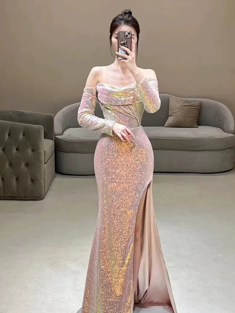 Niulatu Mermaid Strapless Pink Slit Sequin Long Prom Dress Evening Dresses HZ1110