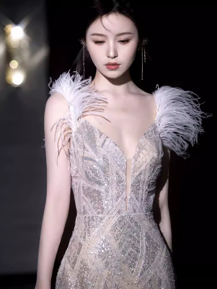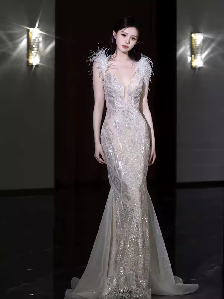 Niulatu Mermaid Straps Sequin Long Evening Dress Feather Prom Dress HZ1110