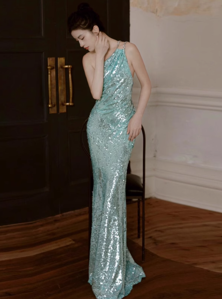 Niulatu Mint Green One Shoulder Memaid Sequins Long Prom Dresses Formal Evening Gowns with Open Back HZ1031