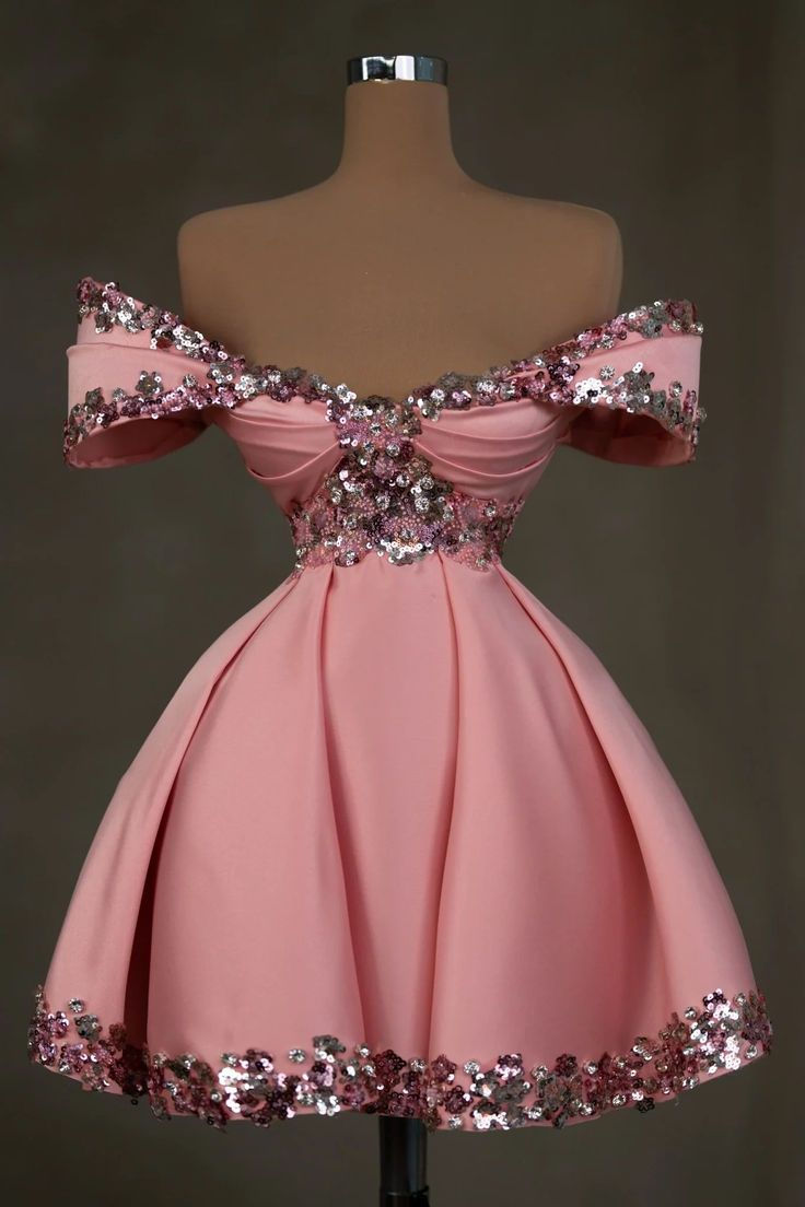Niulatu Pink Off-the-shoulder A-Line Satin Sequin Short Evening Gown Homecoming Dress HZ1031
