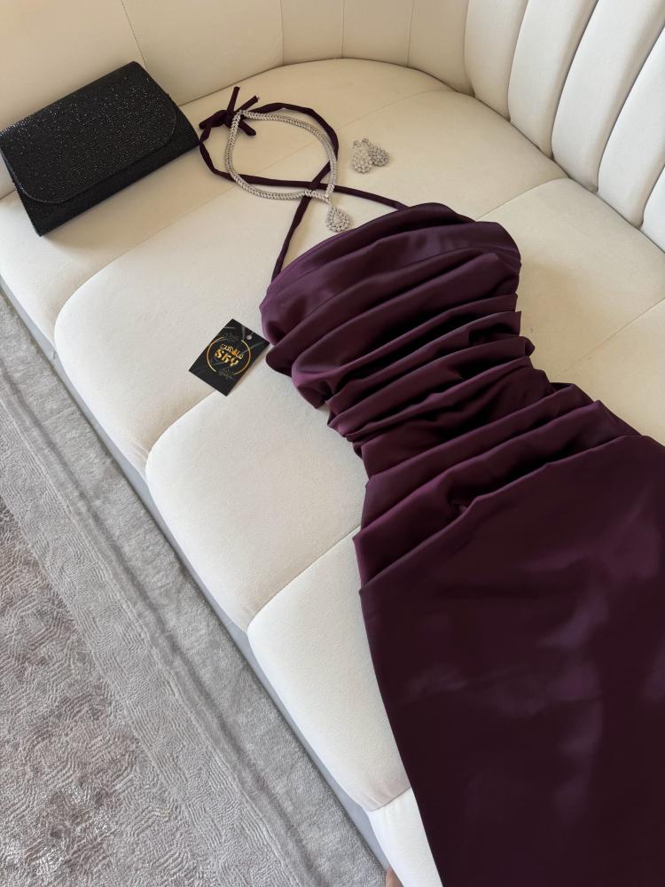 Niulatu Sheath Halter Sleeveless Burgundy Satin Backless Prom Dresses Long Evening Dress HZ1110