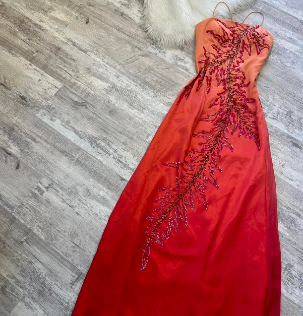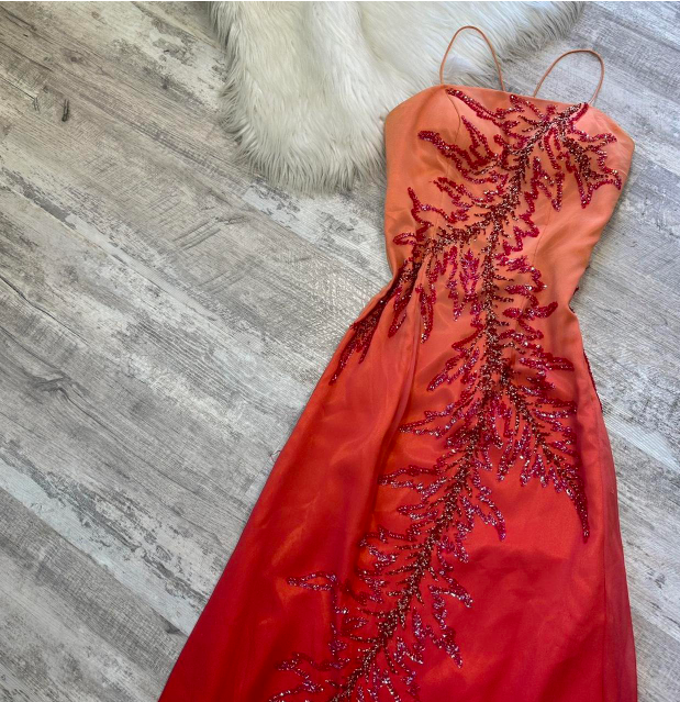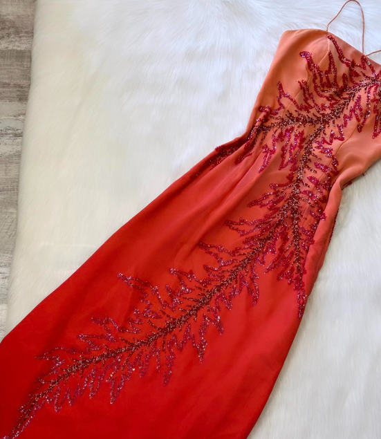 Niulatu Sheath Spaghetti Strap Prom Dress Satin Beaded Dress Elegant Gradient Red Formal Evening Dress HZ1031