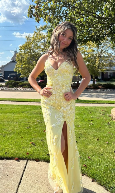 Niulatu Spaghetti Strap Sheath Long Prom Dresses Applique Tulle Yellow Evening Dresses with Slits HZ1026