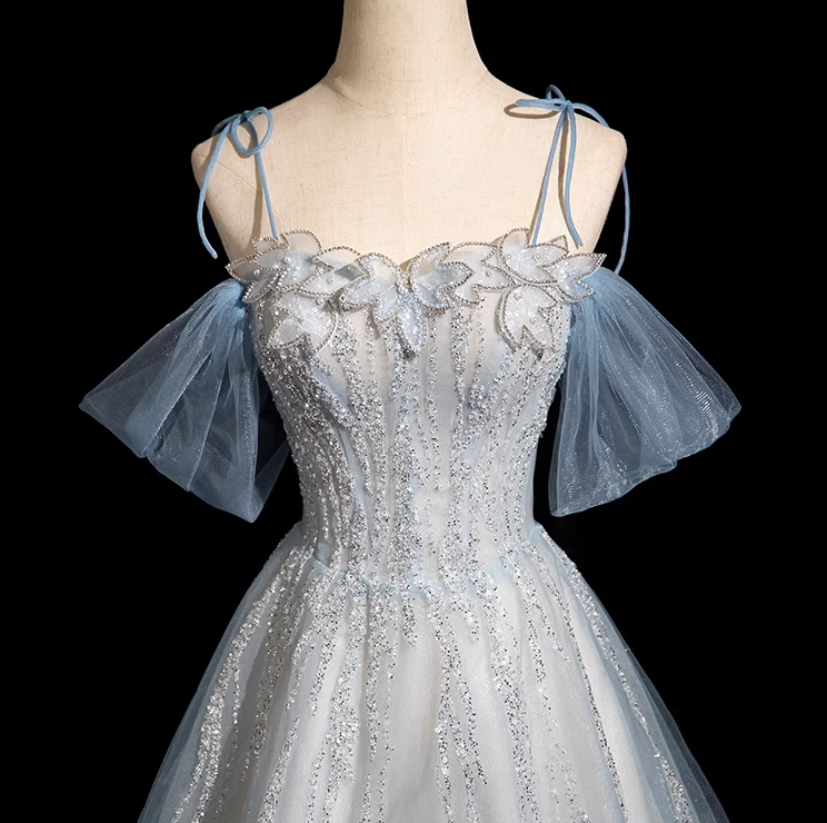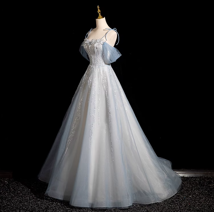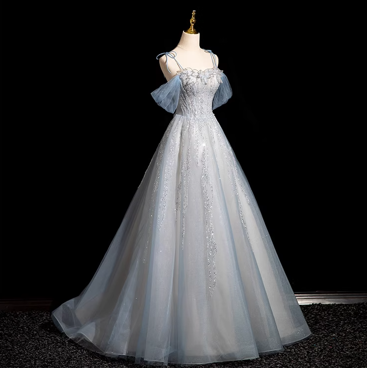 Niulatu Spaghetti Straps Tulle Sequins Long Prom Dress, Sweet Beaded Evening Dress HZ1103