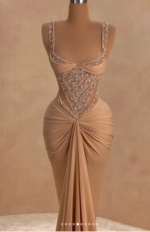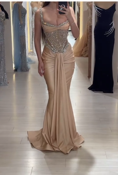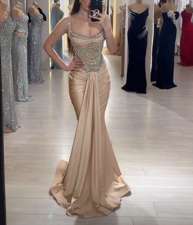 Niulatu Strap Mermaid Long Prom Dresses Champagne Beaded Satin Evening Gown Graduation Dress HZ1031