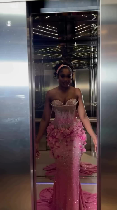 Niulatu Strapless Mermaid Pink Long Prom Dresses Beaded Applique Pink Evening Dresses HZ1026