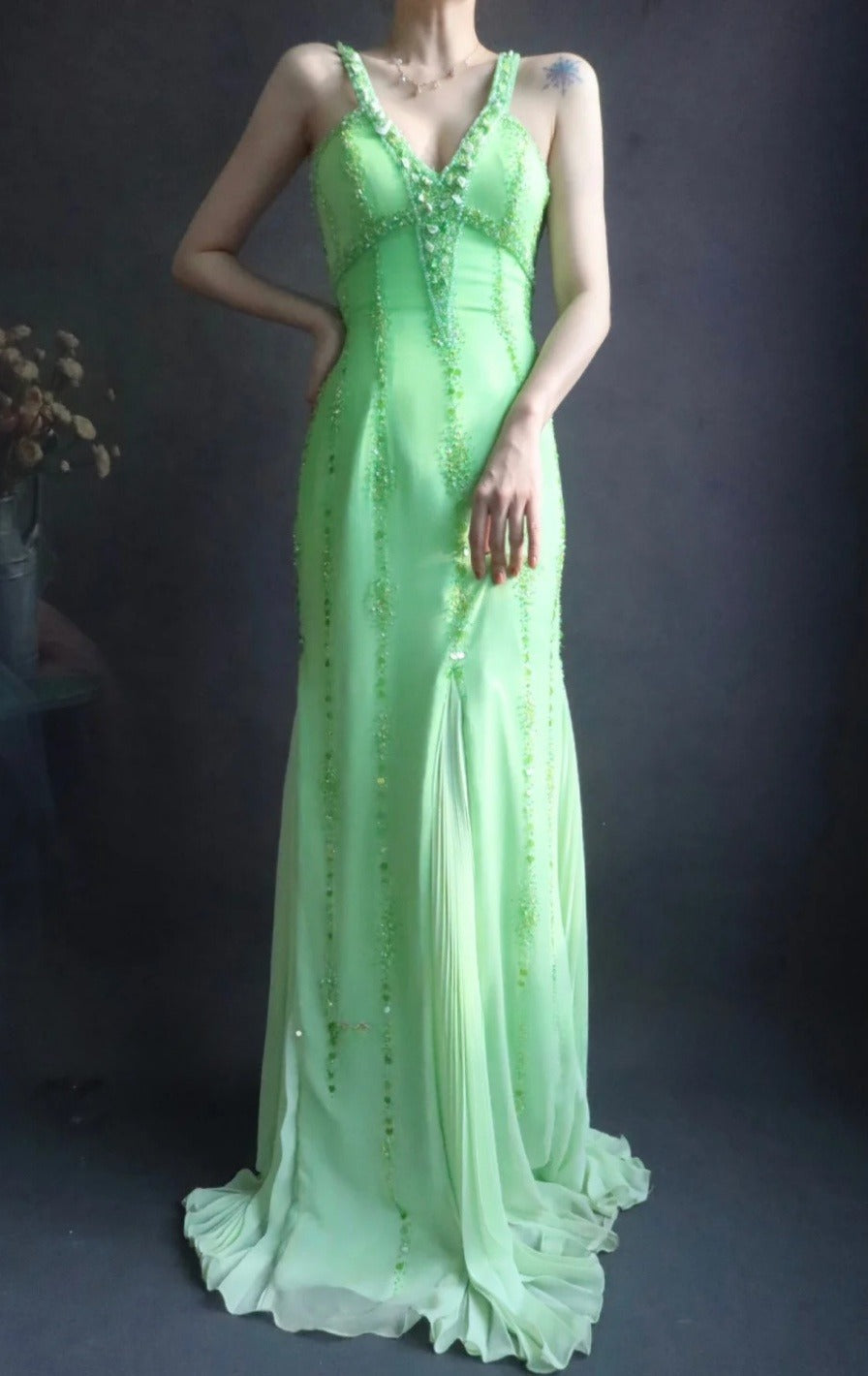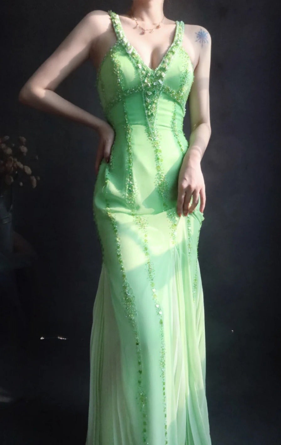 Niulatu V neck Sheath Long Prom Dresses Beaded Chiffon Green Evening Dresses HZ1026