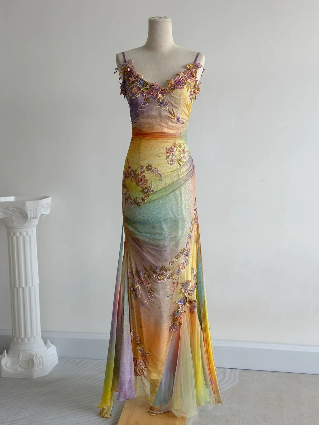 Niulatu Yellow Pink Spaghetti Straps Chiffon Embroidered Appliques Mermaid Prom Dresses Formal Evening Gowns HZ1103