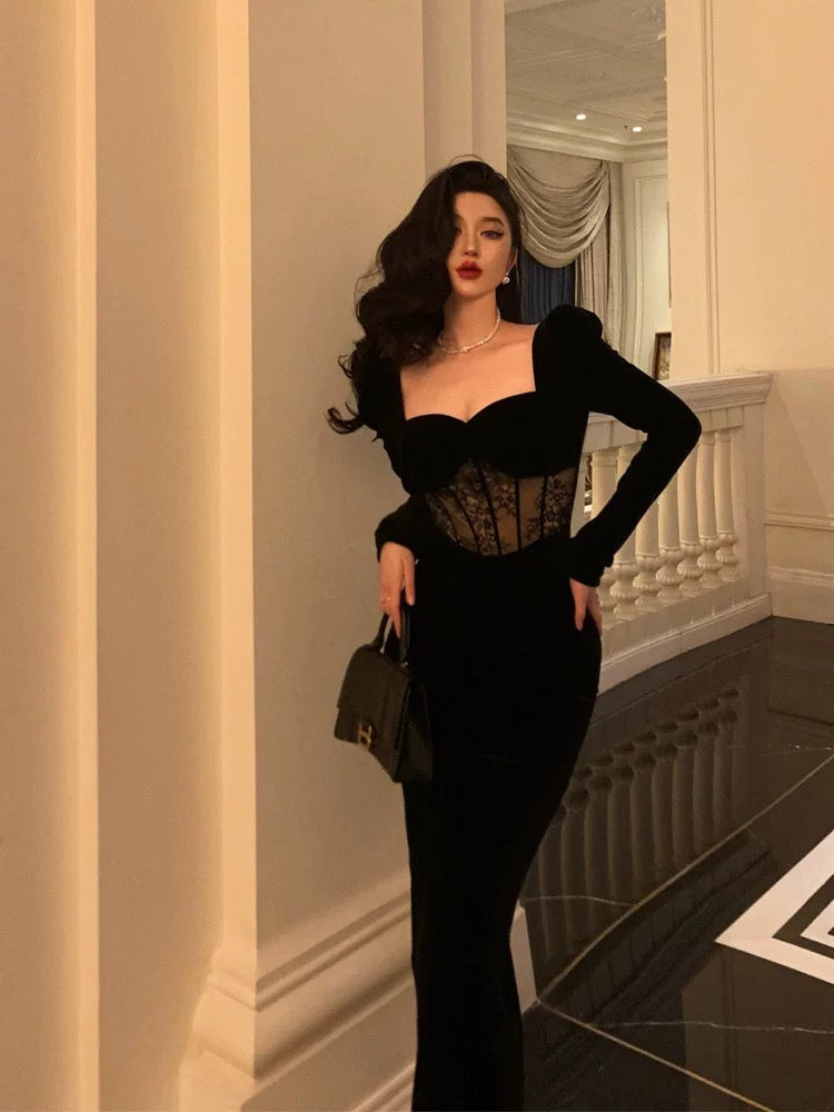Niulatu Sheath Sweetheart Velvet Black Long Sleeves Prom Dresses Evening Dress SD415