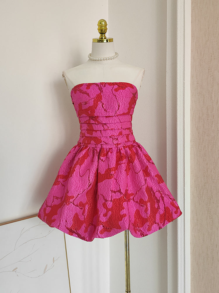 Niulatu A line Strapless Satin Pink Floral Vacation Dresses Short Birthday Dress SD1260