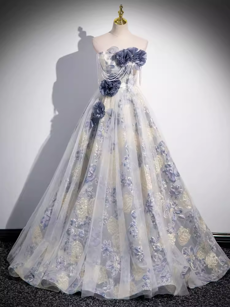 Niulatu A line Strapless Floral Blue Long Prom Dress HZ1110
