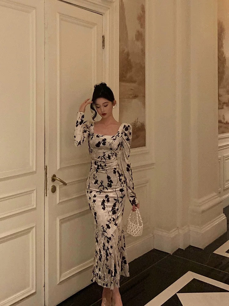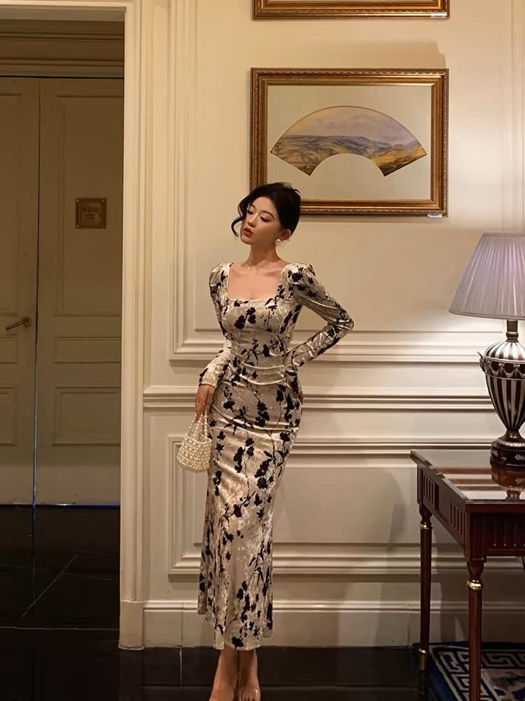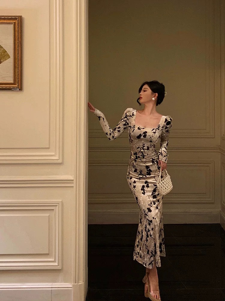 Niulatu Sheath Black Floral Velvet Long Sleeves Prom Dresses Birthday Outfits SD310