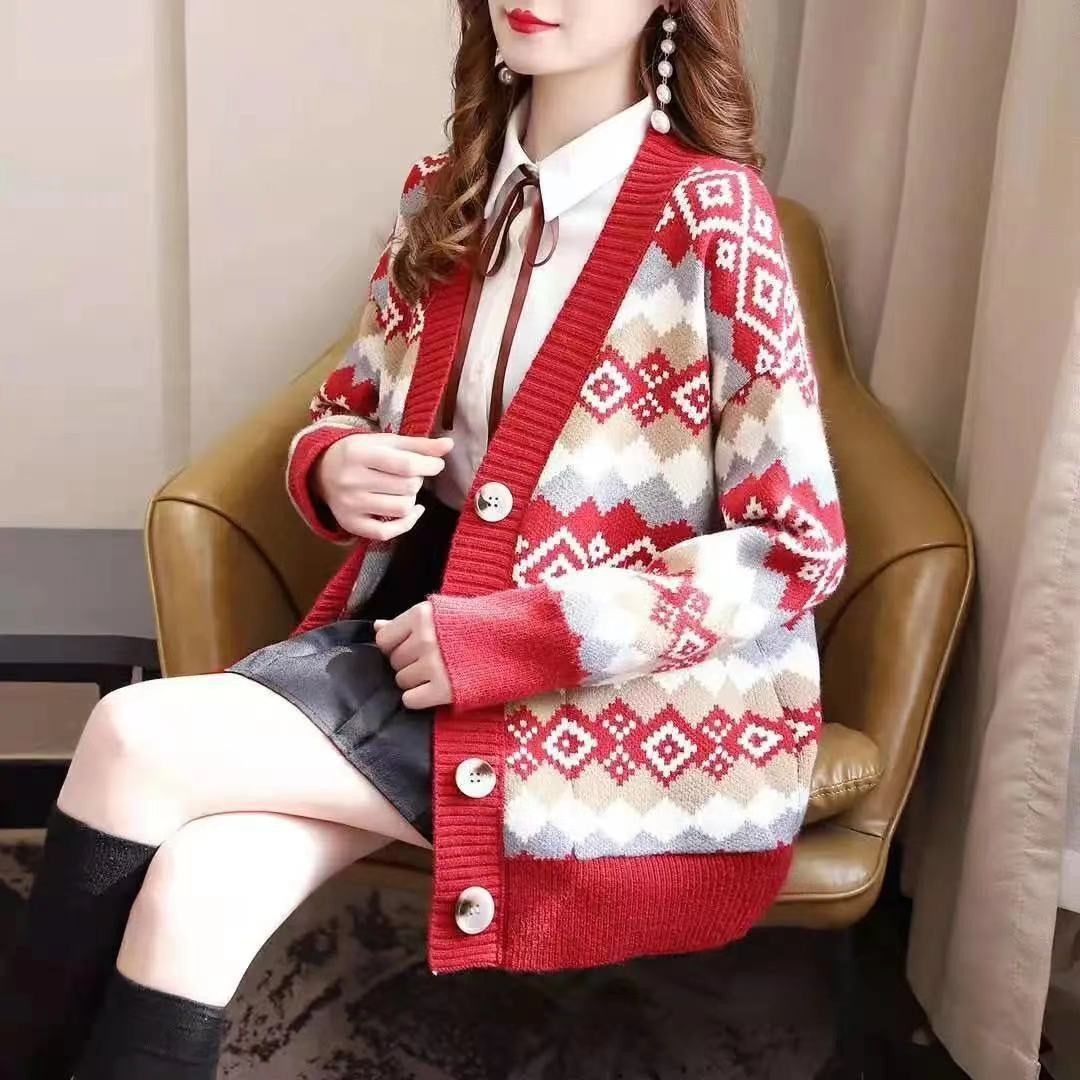 Autumn And Winter Red Rhyme Sweater Cardigan Jacket Women's New Loose Lazy Wind Women's Knitwear In The Spring And Autumn Of 2025 HZ0108