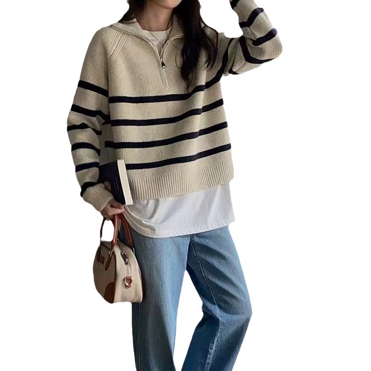 Korean Chic Autumn/Winter French Lazy Half Zipper Loose Casual Colling Striped Long-Sleeved Knitted Sweater Woman HZ0108