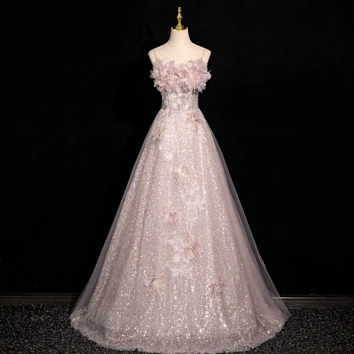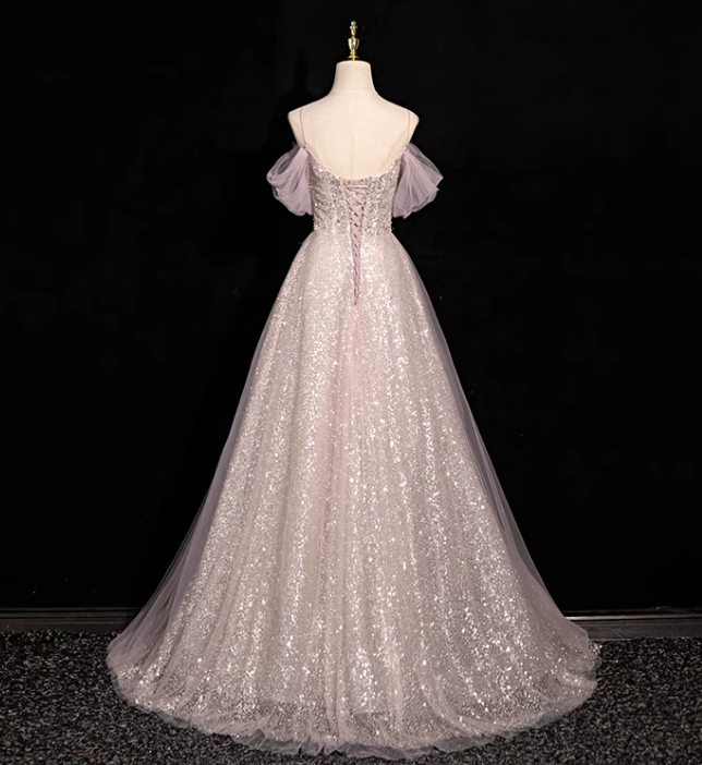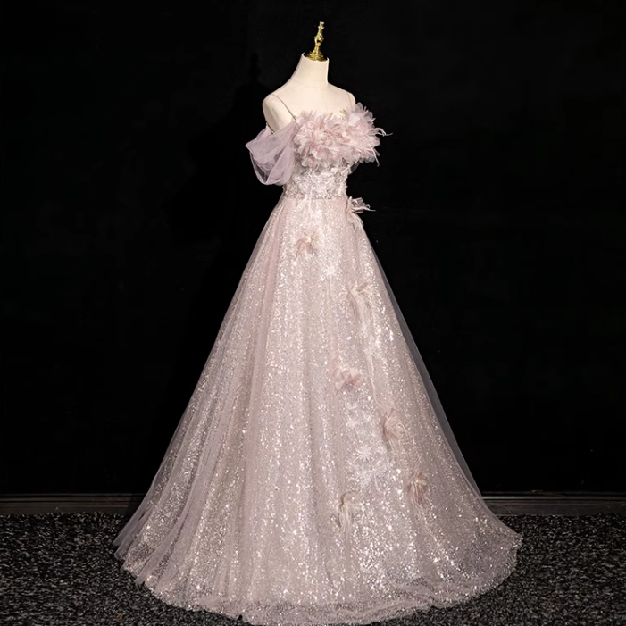 Niulatu A-line off-shoulder sequined tulle long prom dress, pink formal long dress HZ1108