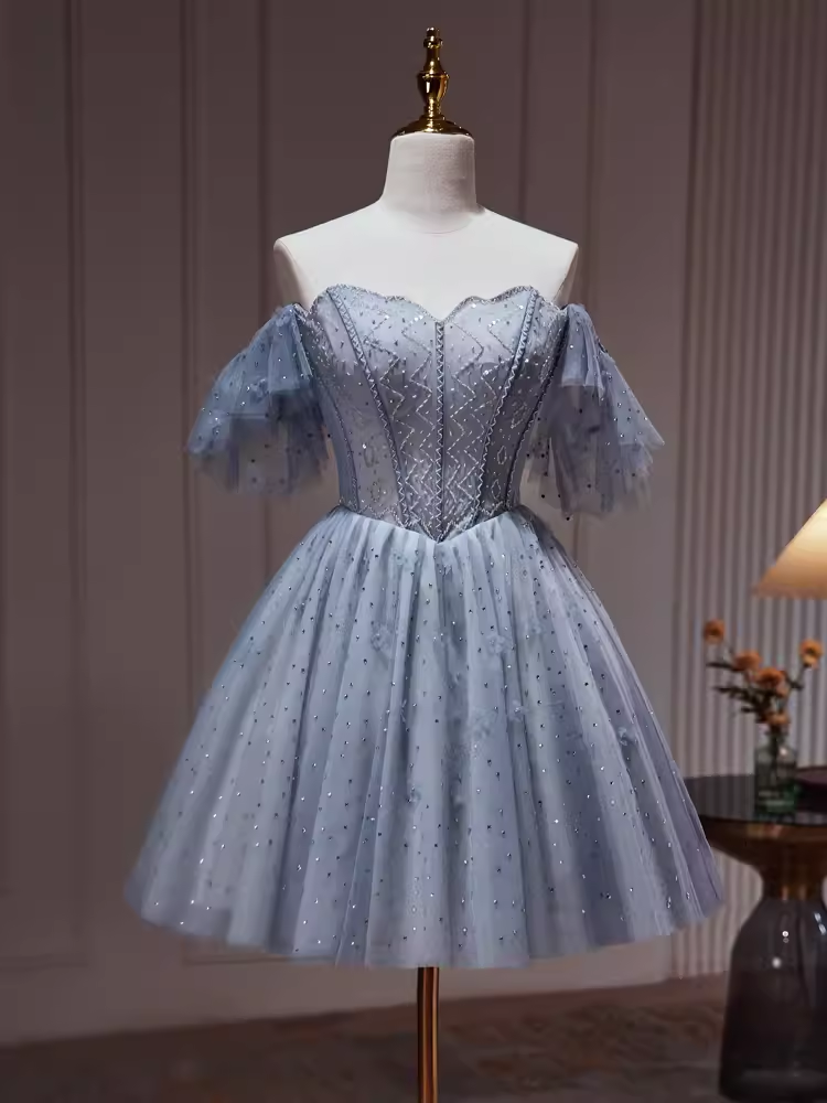 Niulatu A line Off The Shoulder Tulle Gray Blue Homecoming Dresses HZ1110