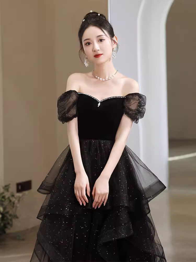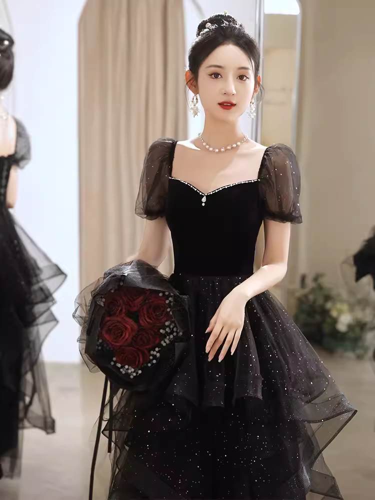 Niulatu A Line Short Sleeves Black Prom Dress Tulle Birthday Outfits HZ1110