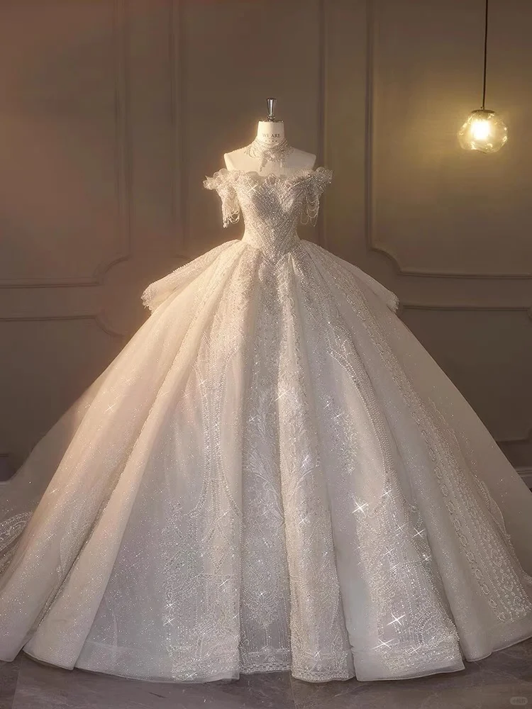 Niulatu Ball Gown Off The Shoulder Tulle Sequin Beaded Long Wedding Dresses HZ1110