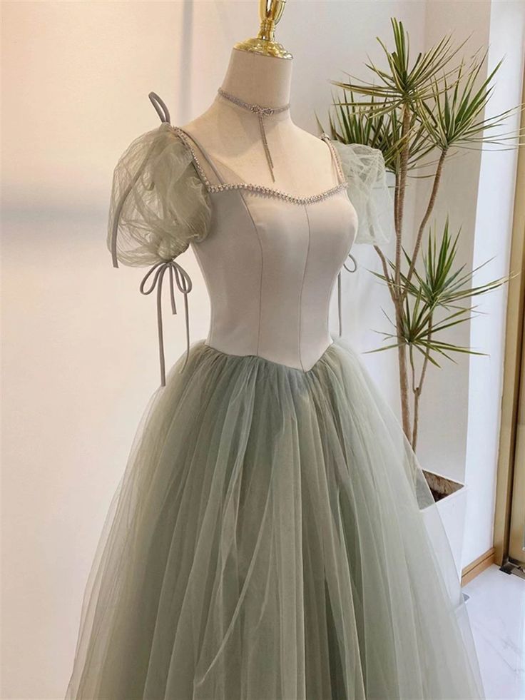 Niulatu line Short Sleeves Green Satin Tulle Long Prom Dress HZ1110