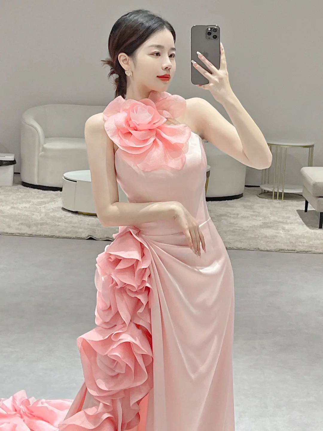 Niulatu Mermaid Halter Pink Satin Flowers Long Prom Dresses HZ1110