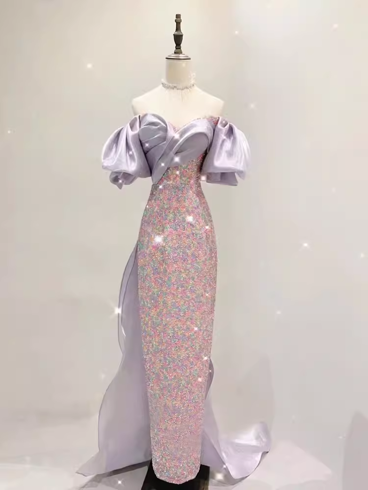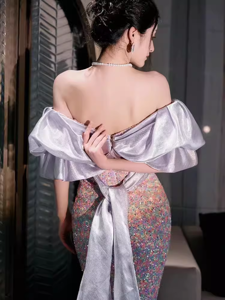 Niulatu Mermaid Short Sleeves Satin Sequin Long Sequin Prom Dresses HZ1110