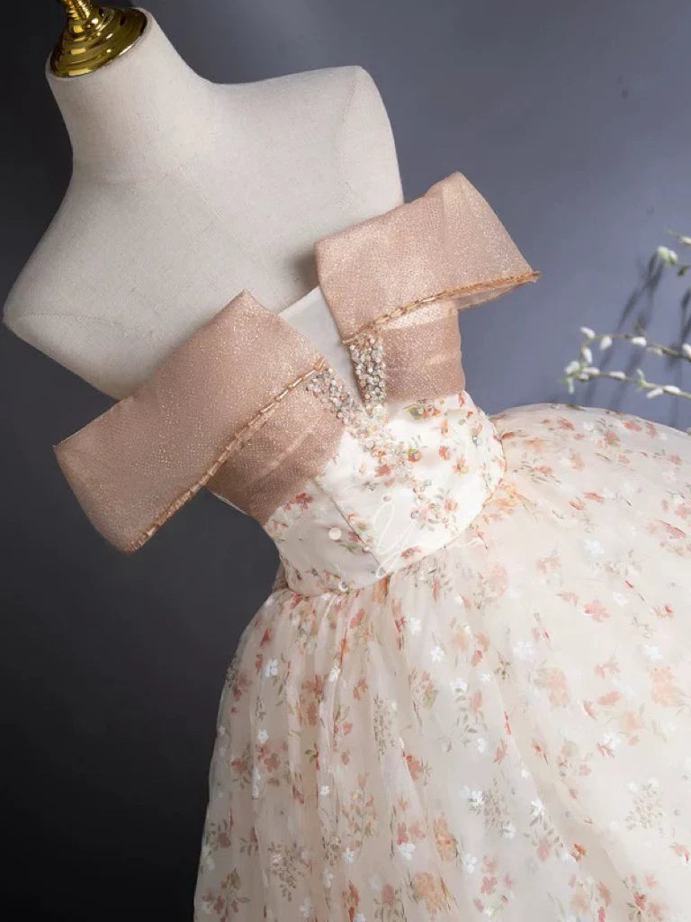 Niulatu Off Shoulder Tulle Lace Champagne Long Prom Dress, Champagne Formal Dress HZ1108
