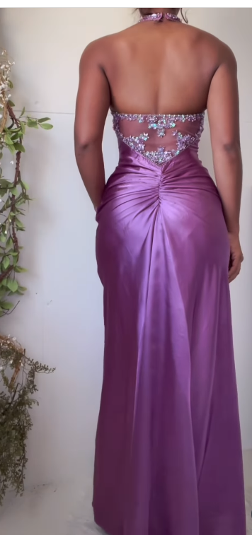 Niulatu Purple Sheath Long Prom Dresses Elegant Satin Halter Beaded Evening Gowns 22nd Birthday Dress HZ1031