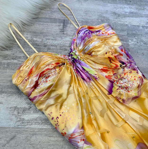 Niulatu Spaghetti Strap Sheath Long Prom Dresses, Floral Silk Guest Dresses, Yellow Formal Evening Dresses HZ1026