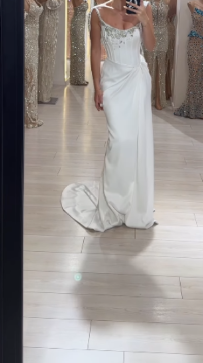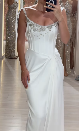 Niulatu White Sheath Long Prom Dresses Elegant Satin Formal Dress Beaded Trailing Evening Dress HZ1031