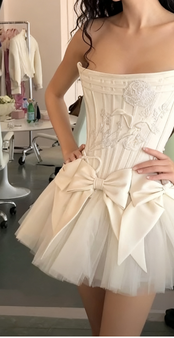 Niulatu White Strapless A-Line Satin Tulle Short Prom Dresses Homecoming Dresses with Bow HZ1031