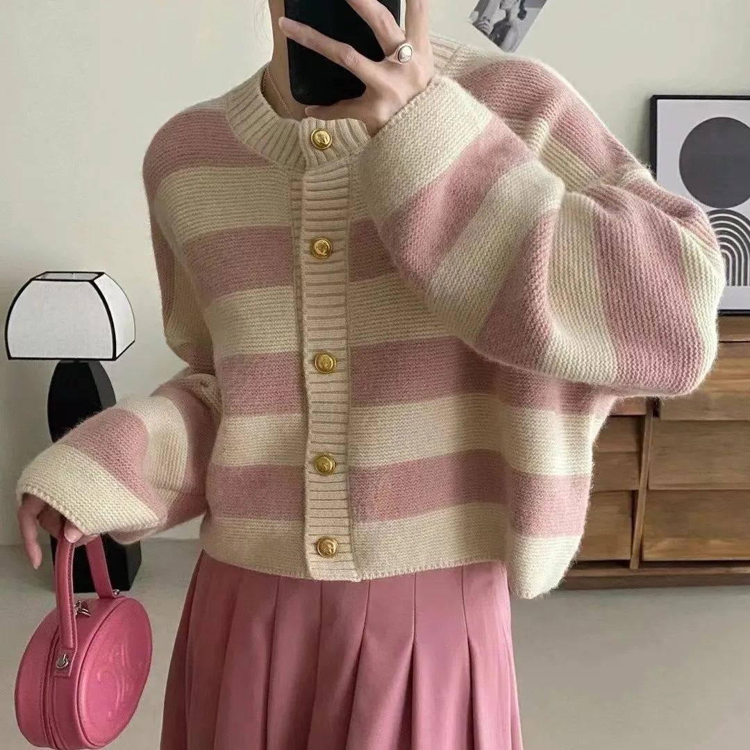 Soft Glutinous Bumpy Stripe Short Knitted Autumn And Winter French Style Languid Loose Outer Sweater Coat HZ0108