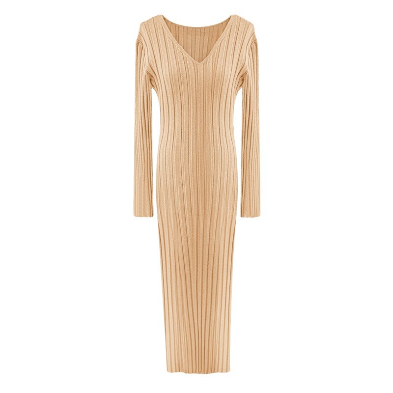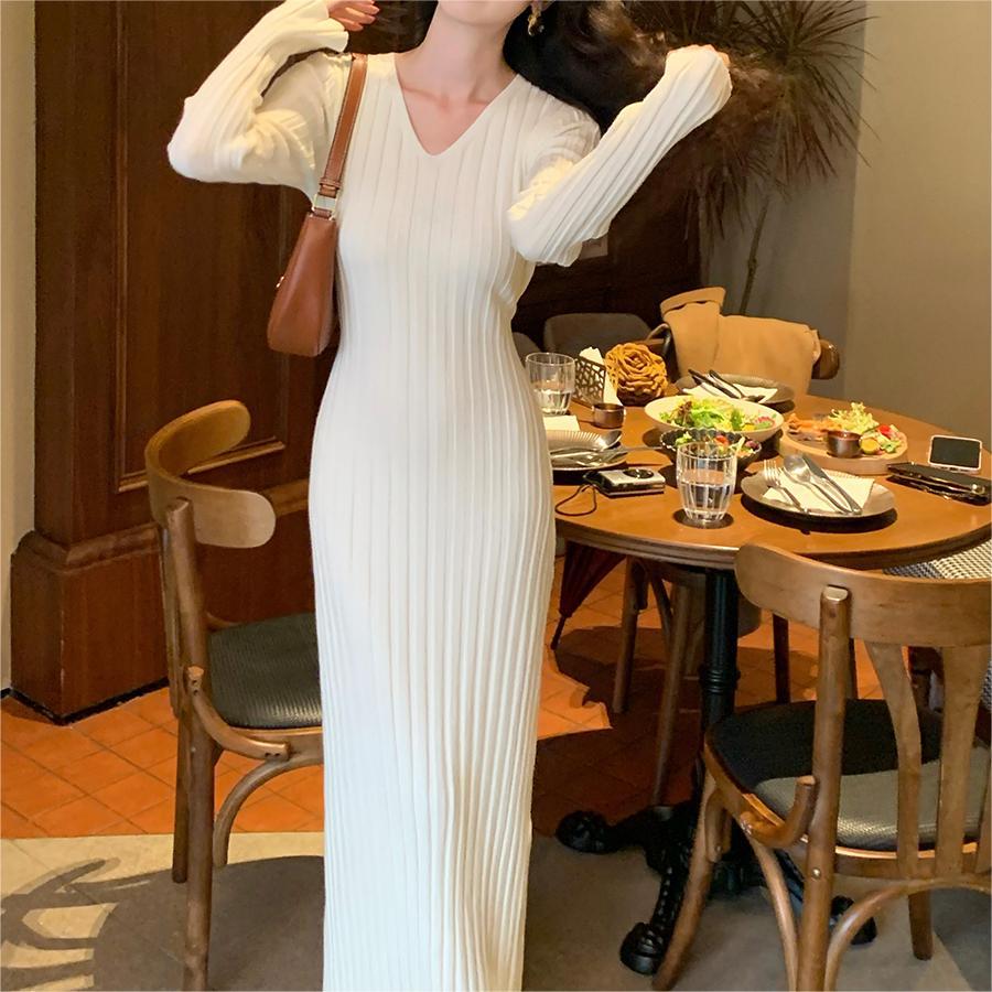 French Retro V-Necked Knitted Dress Women's Autumn And Winter New High-End Feeling Waist With Coat Bottom Skirt HZ0108