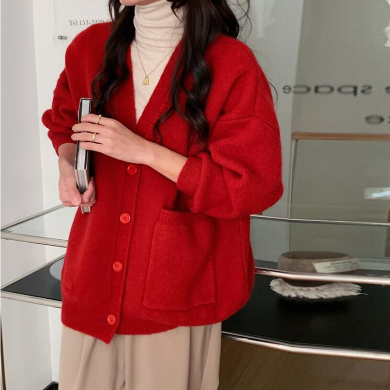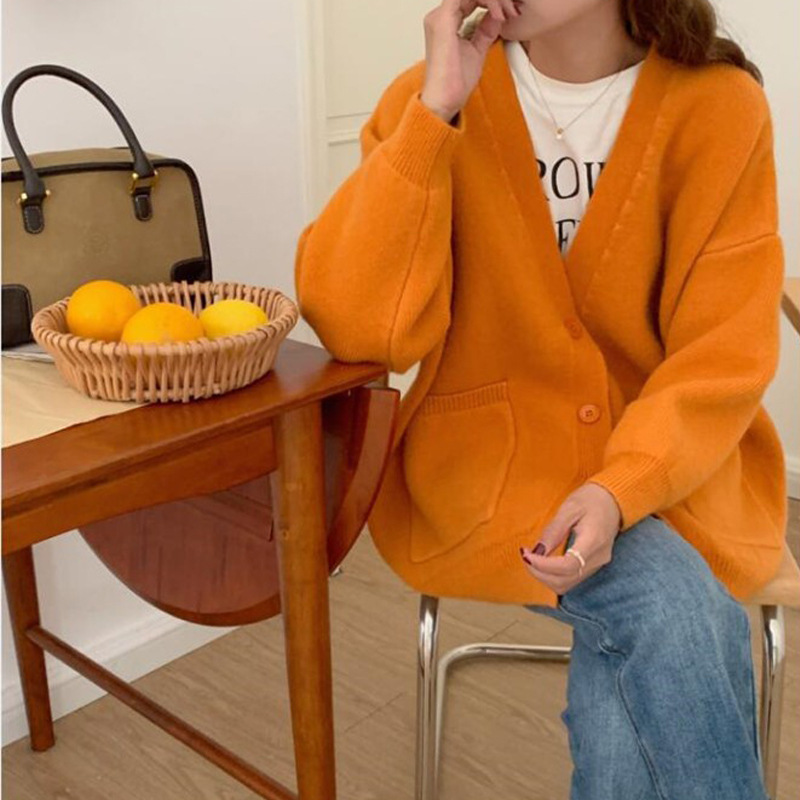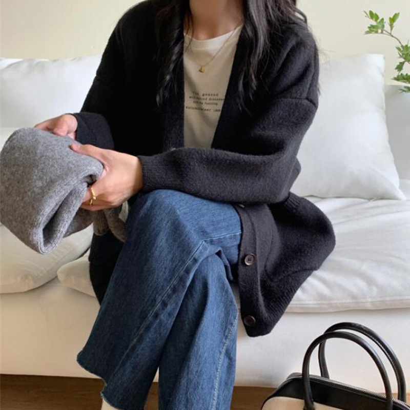 Korean Version Of V-Neck Knitted Cardigan Women 2025 Autumn New Lazy Wind Loose Soft Sweater Coat Women's Clothing HZ0108
