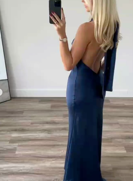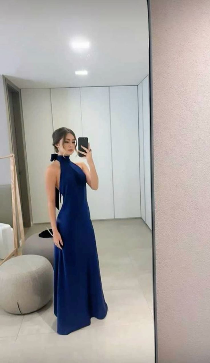 Niulatu A line High Neckline Streachable Satin Navy Blue Long Prom Dresses Evening Dress HZ1110