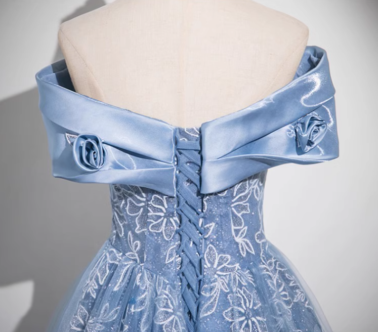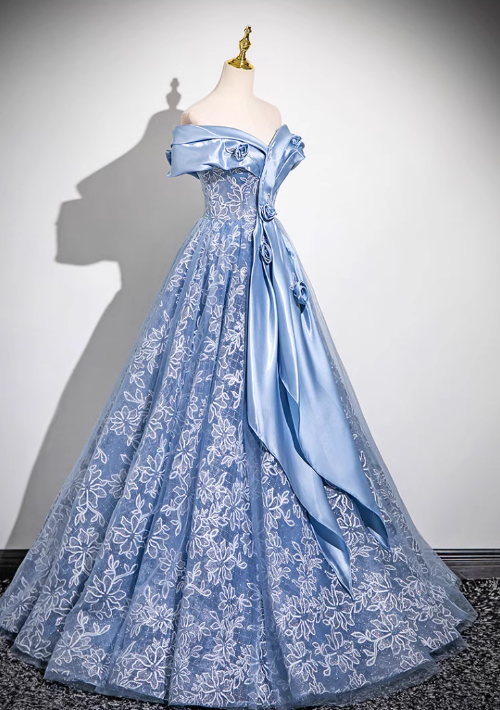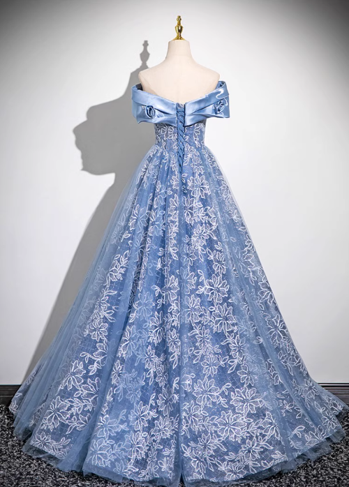 Niulatu A-line Off-shoulder Tulle Satin Long Prom Dress, Blue Evening Dress HZ1108