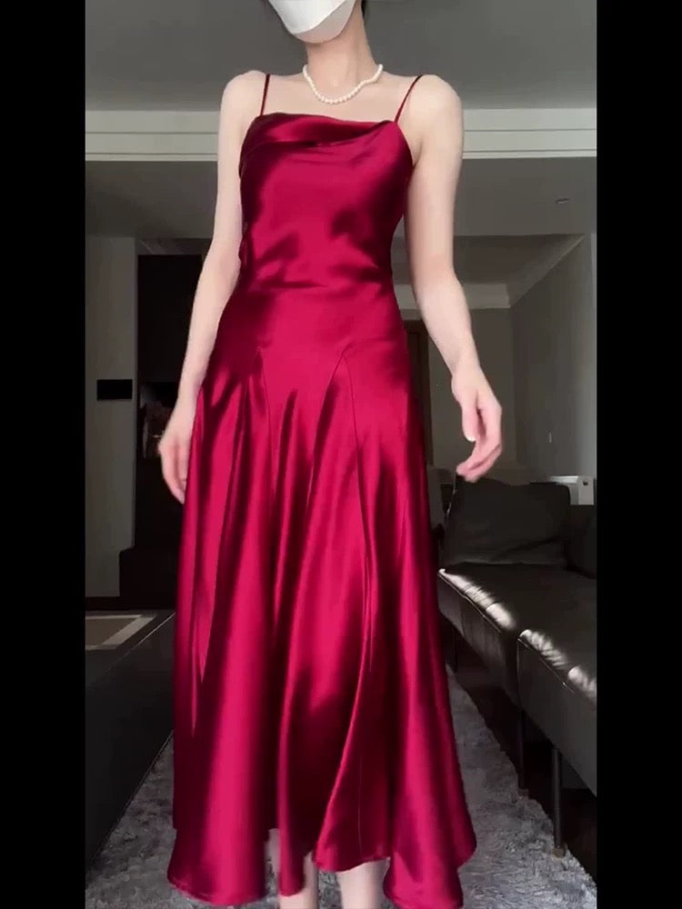 Niulatu A Line Spaghetti Straps Red Satin Long Floor Length Prom Dresses HZ1110