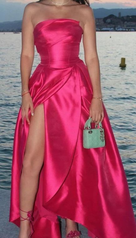 Niulatu A line Strapless Hot Pink Slit Satin Long Prom Dresses HZ1110
