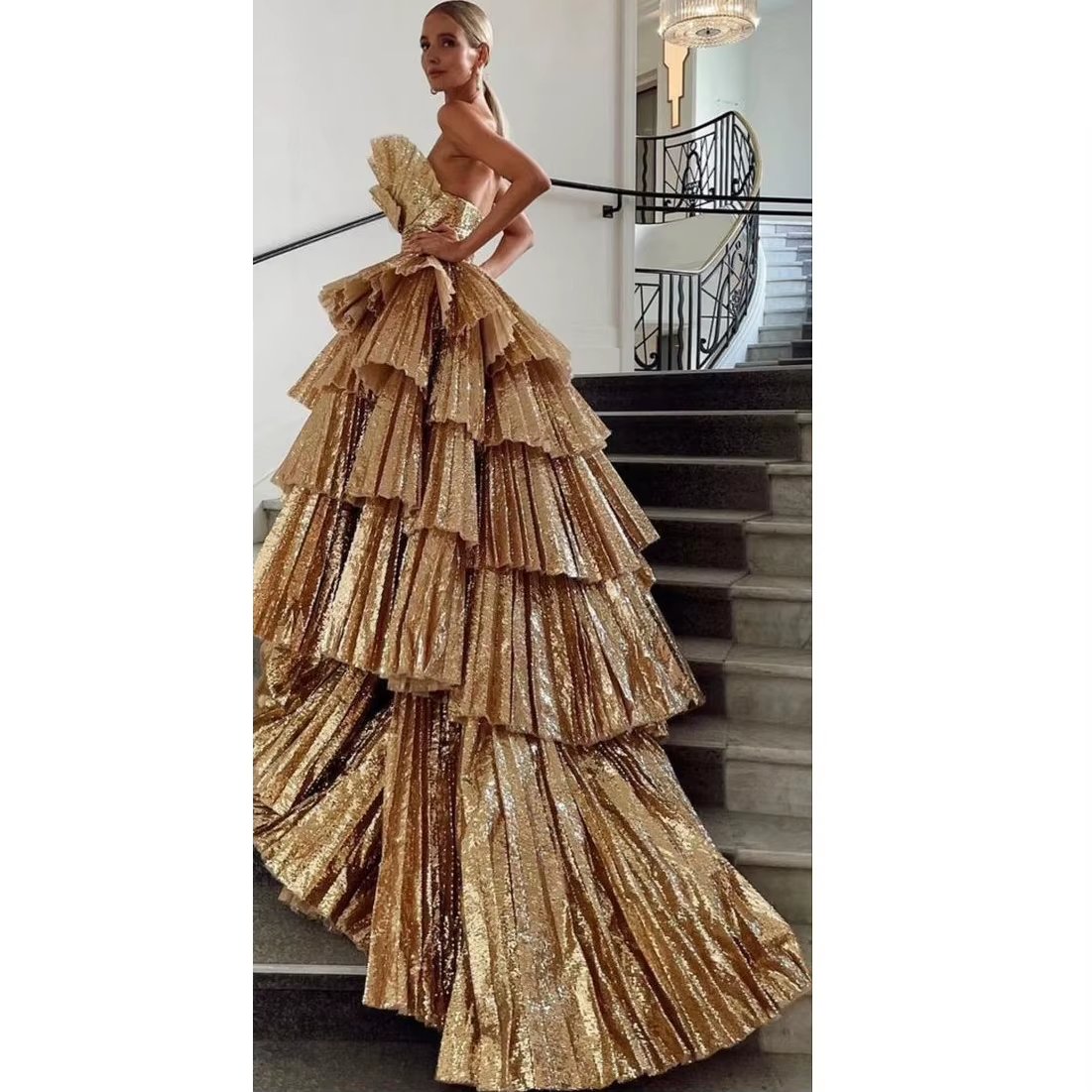 Niulatu Ball Gown Strapless Gold Sequin Long Prom Dresses Evening Dress HZ1110